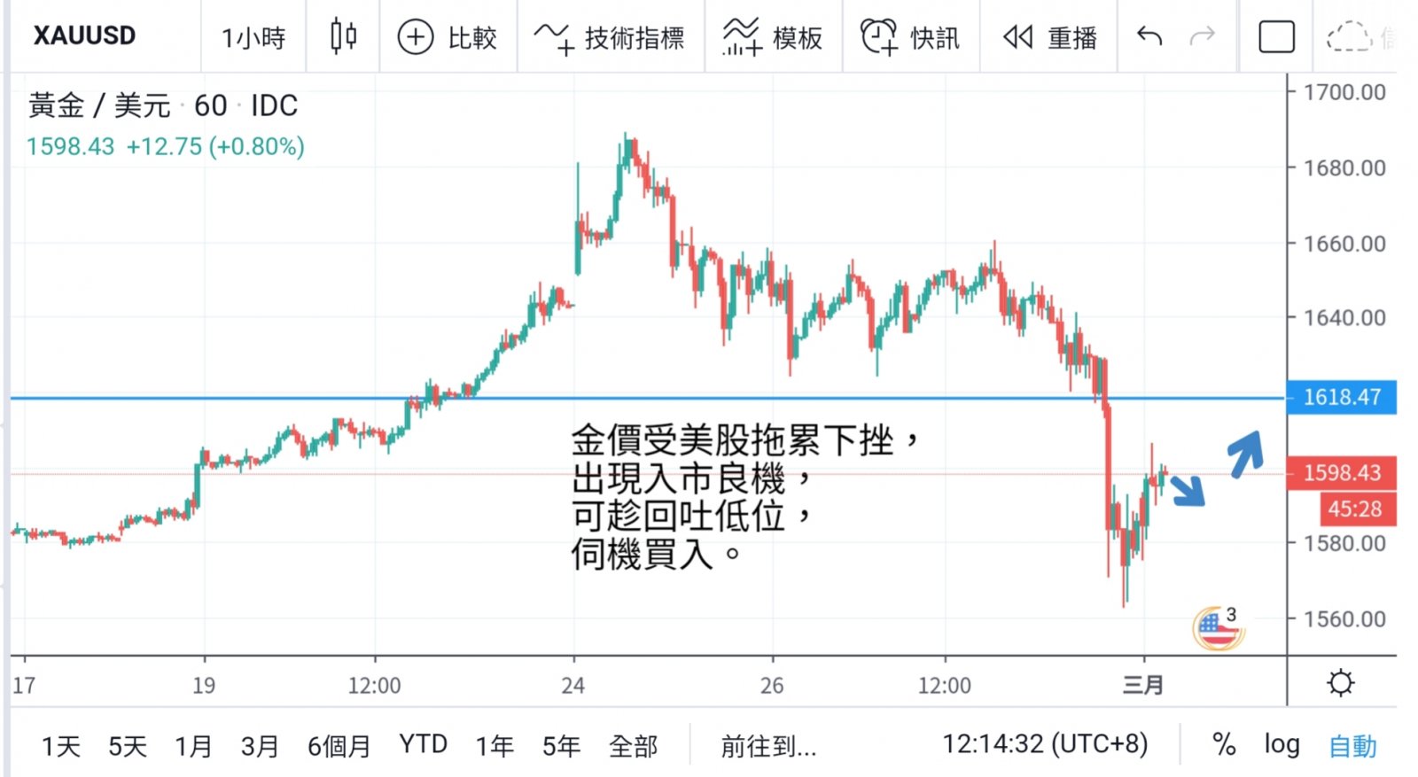 金價上週急挫至1562水平未必能重見,1600水平會出現一段好淡爭持,但方向上,傾向見底反彈,因此策略亦以回位買入為主。