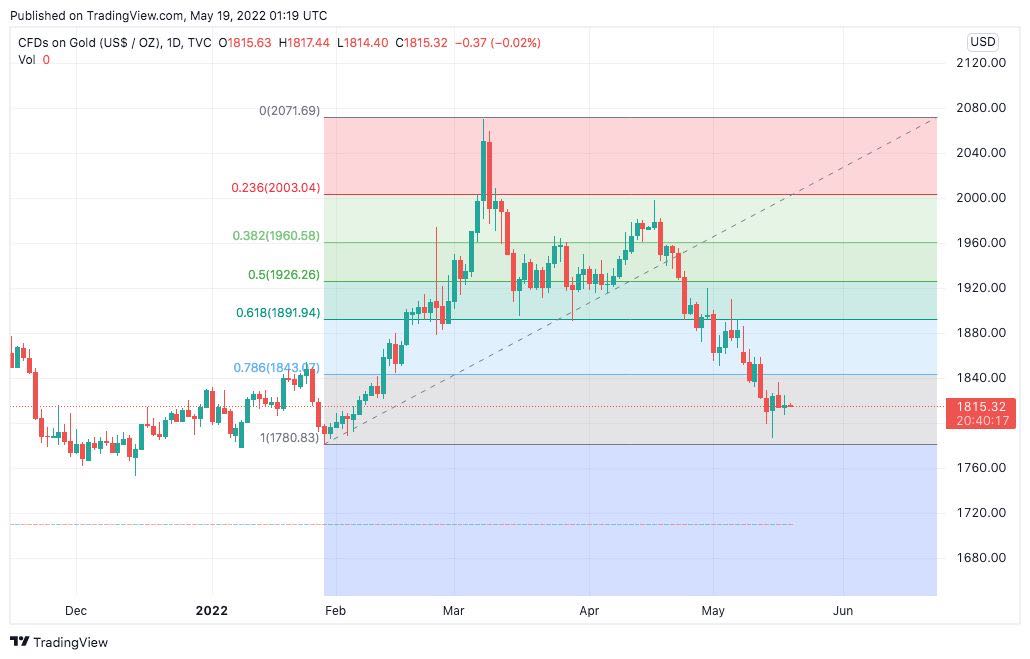 Points, down 3.57%. Standard & Poor's 500 index futures fell 4.04%, while Nasdaq 100 index futures fell 4.73%. Yesterday, the lowest price of gold was 1807.2, the highest price was 1824.5 USD, and the last price was 1816.3 USD.