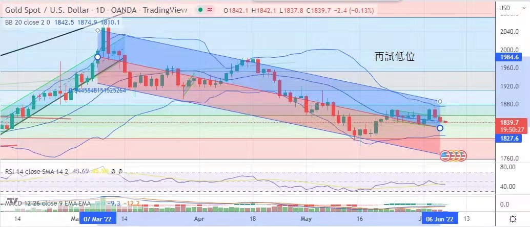 The interest rate is up to 3%, depressing the price of gold. The gold price has the opportunity to try last week's low again, and today's suggested volatility is $1,832 to $1,844.