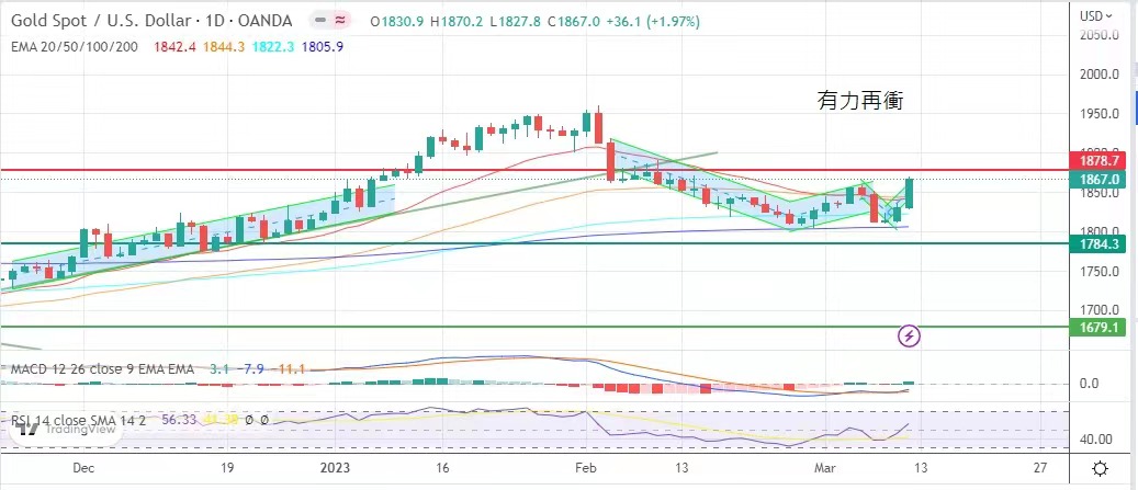 Slow down, the market expects that the probability of raising interest rates by 50 points in March will soften to less than 50%, coupled with the thunder of Silicon Valley Bank in the United States, and the tension of risk aversion will push the price of gold.