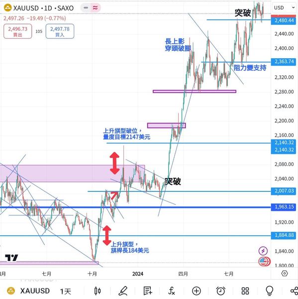 The price of gold opened at 2502.66 last week and closed at 2497.23, with a slight drop of $5 for the whole week. However, the high and low prices fluctuated by more than $50, consolidating around the historical high, but the breakthrough momentum was not high. The market has fully digested the interest rate cut by the Federal Reserve in the middle of the month, but there are still differences on how much to cut interest rates. The US dollar index has been continuously pressured to the 100 mark in recent months and began to struggle, which has also caused the price of gold to rise and fall repeatedly.