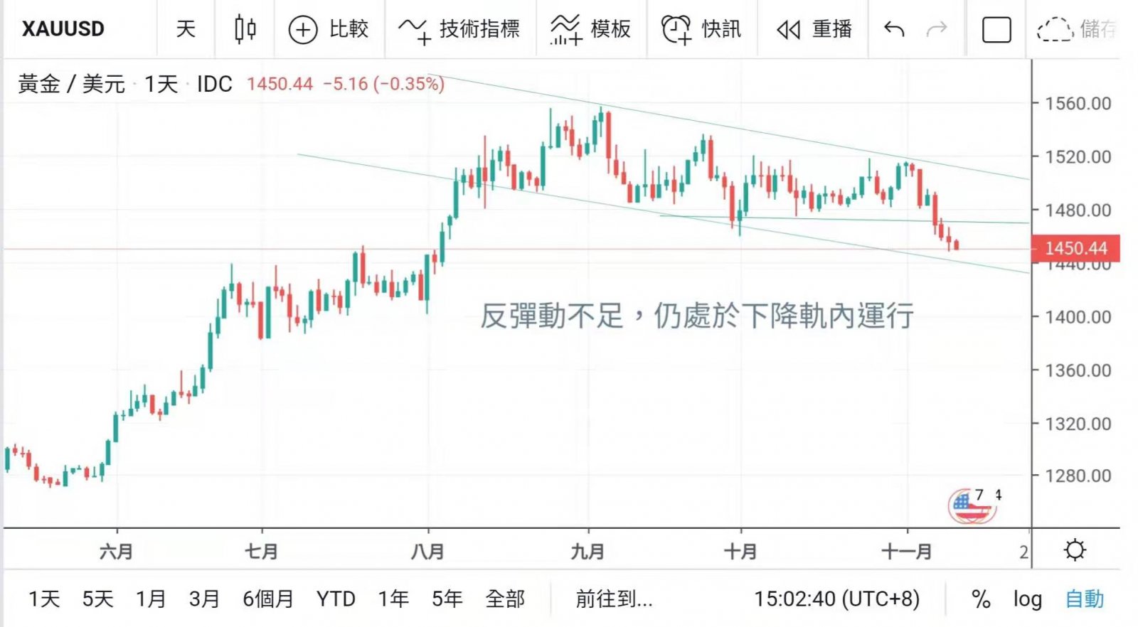 低位稍見盤迴補,收市前能回守1450上方,但今晨起又見金價再現壓力,黃金價格仍未找到其中線支持。