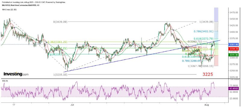 Although I predicted last Friday that gold prices would end the decline that began on July 23rd on that day, the price did indeed rebound strongly, but its sudden break above the 20-day and 50-day SMAs to reach a high of $3,363.50 was unexpected. Clearly, the main reason was that the number of new non-farm jobs added in the US in July was less than expected. The overall non-farm payroll increased by only 74,000, less than the expected 106,000, and private sector jobs increased by only 83,000. However, what was even more surprising was that the number of new jobs added in June was revised sharply downward from an initial estimate of 147,000 to only 14,000; the number of new private sector jobs was also revised sharply downward from an initial estimate of 74,000 to only 3,000, while the unemployment rate rose by 0.1 percentage point as expected to 4.2%.