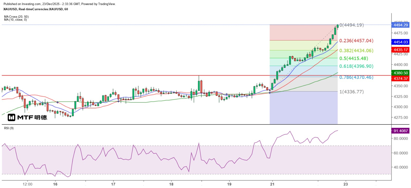 From the hourly chart, spot gold prices broke above the top of the sideways range of $4,374.37 since December 12 last Friday and have been climbing along the 10SMA (currently around $4,453). This is the first time I have mentioned the 10SMA because the price of gold often fluctuates around the 10SMA and it has lost its reference value. However, now that the gold price can remain stable and continue to rise below the 10SMA, it reflects a stable upward trend. In other words, closing below the 10SMA on the hourly chart can also be regarded as a signal of a decline. As of now, from the hourly chart, the upward trend after the break last Friday has not yet sent out a reversal signal.
