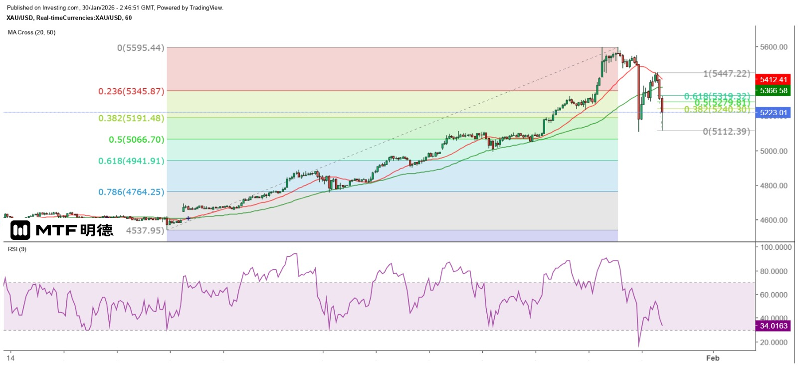 Subsequently, the gold price began to rebound. From the hourly chart, it can be seen that the gold price slightly broke above the 20SMA (currently around 5408.2) in the early Asian session today, but then fell again, with a sharp decline, reaching a low of 5112.39 US dollars before starting a more substantial rebound. From a technical perspective, a double bottom pattern was formed at the 5100 US dollar level, and 5110 US dollars is the 135-degree angle of the Gann Square, which is a relatively strong support or resistance level. In other words, the gold price may temporarily stop falling and fluctuate above 5100 US dollars. However, the decline in the Asian session has been so strong that the possibility of a significant sell-off in the European and New York sessions is very high. Additionally, if the gold price breaks below 5100 US dollars, the stronger support level is at 4960 US dollars, and 5000 US dollars should be a key level for bulls to defend. Therefore, it is temporarily judged that the gold price can still fluctuate above 5000 US dollars.