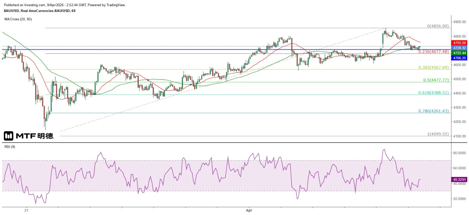 As for the gold price, from the hourly chart, it is observed that the gold price has found strong support at around $4,700, which is also the top of the sideways range from April 2nd to 7th. It is believed that this level has become a short-term strong support. From the Gann Square, the larger fluctuation range is expected to be between $4,660 and $4,860, while from the Gann angle, it is between $4,660 and $4,810. Yesterday, the gold price dropped sharply from the high, which is believed to be due to approaching the 50SMA on the daily chart (currently around $4,900). Therefore, even if the gold price rises further in the short term, this line remains a medium-term resistance. Don't forget, the gold price has re-entered a bear market!
