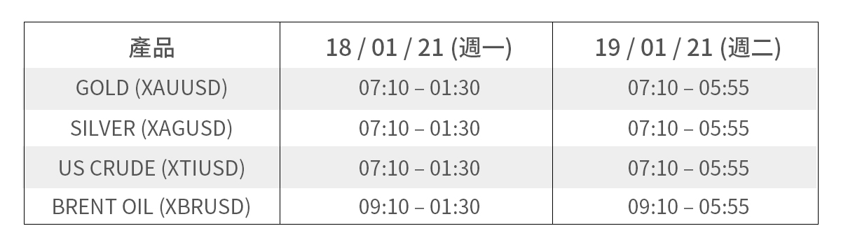 18 / 01 / 21(週一)為馬丁路德日假期,美國金融市場休市,以下產品交易 時間會有改變,具體如下:
