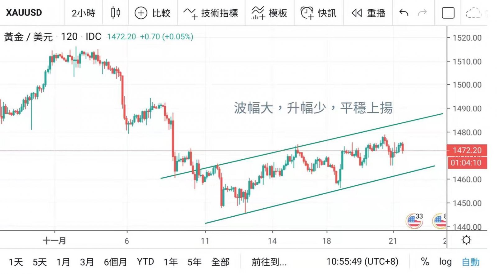 但隨着美股市場下瀉,金價終得到支持,保持輕微上升型態。
