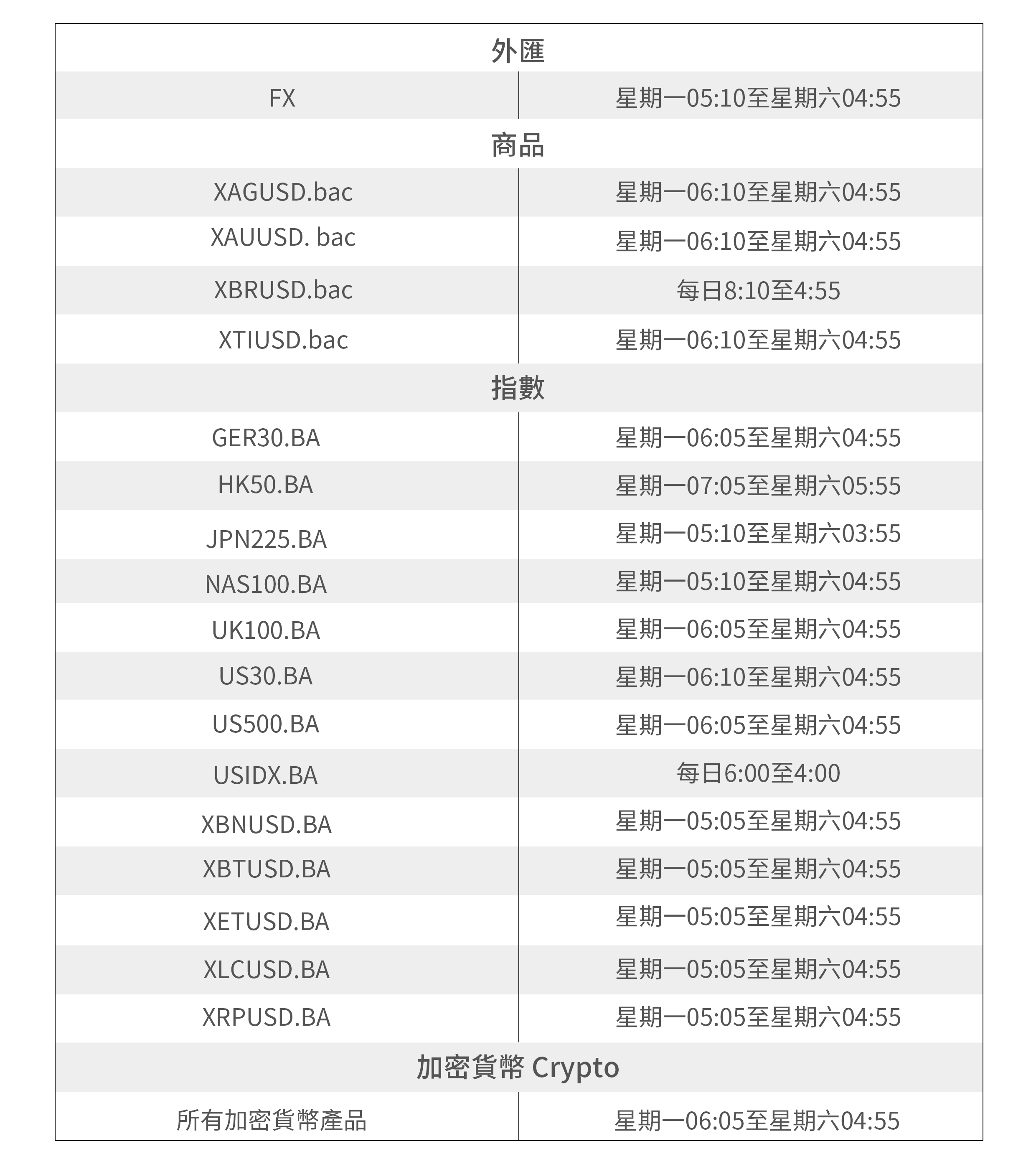 請注意,由於夏令時開始,明德金融交易時間有所變動。以下時間適用於2021年3月14日(星期日)至2021年11月7日(星期日),所有時間均為北京時間(GMT+8)。具體如下: