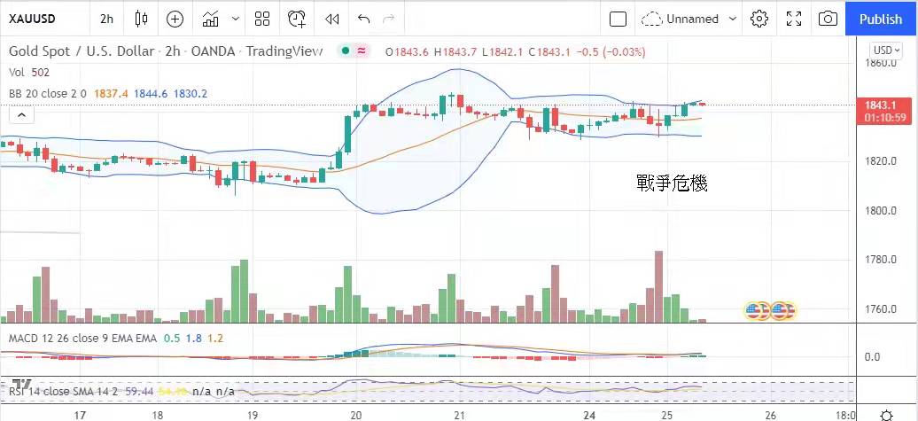 俄羅斯持續在烏克蘭及其周邊地區增兵,惹來北約盟國派遣更多艦艇和軍用飛機。而美國美國總統拜登亦正在研究向波羅的海和駐軍數千名美軍,及派遣戰艦和戰機出發,以應對烏克蘭局勢變化。市場避險情緒進一步升溫,戰爭危機甚至蓋過美聯儲加息的動向。昨日金價收市成功企在1840美元以上,正在挑戰上周出現的高位。今日建議波幅1835美元至1848美元。