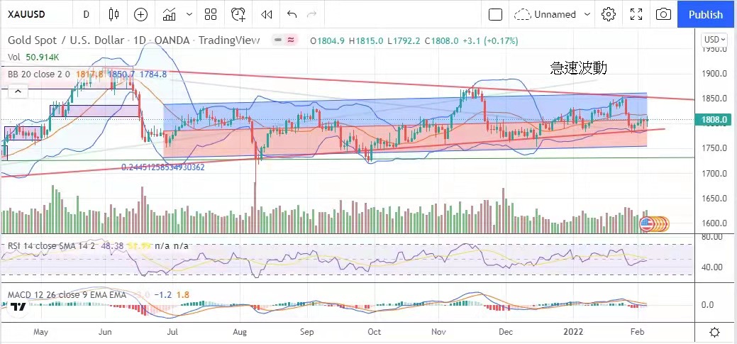 金市正徘徊於十字路口;前途定奪於俄羅斯與烏克蘭對峙的發展。上星期北京冬季奧運會開幕前夕,中國國家主席習近平與俄羅斯總統普京會晤,會後雙方除了展示經濟合作之外,並發聯合聲明,呼籲北約停止擴張。中俄再度結盟,對抗以美國、英國、澳洲為首,與及聯合北約組織的共同力量,預計俄羅斯不敢貿然開戰;但在有結果之前,不明朗的局勢,將造就避險情緒升溫,對金市較為有利。然而,金市下行機會更大,因美國在三月加息是鐵一般的事實,投資者還要面對加息的力度的風險!預料本周金市將震盪,今日建議波幅的1802美元至1815美元。