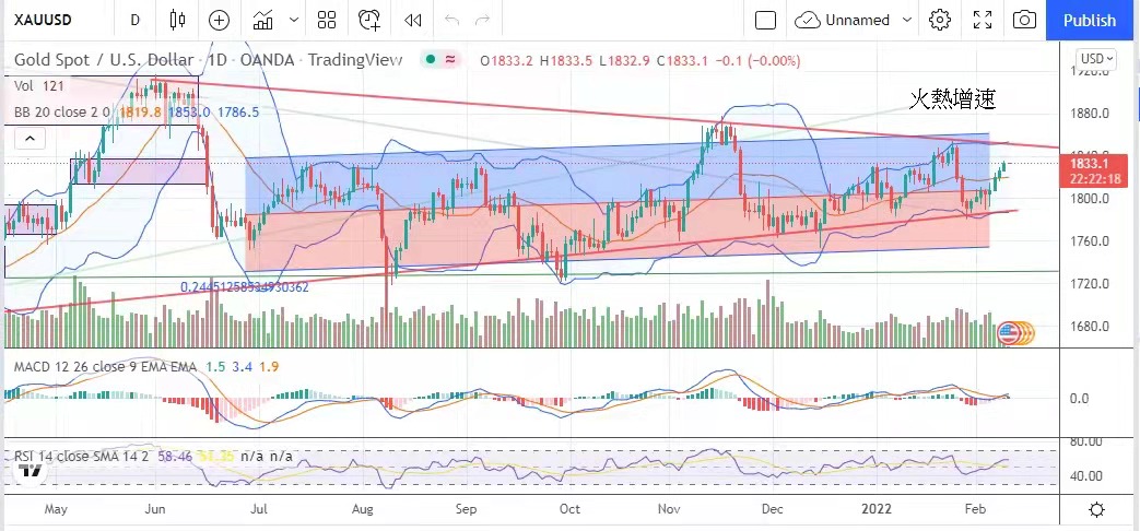 Continue to bet on the January consumer price index data released tonight, making the price of gold rise for four days in a row. Yesterday, the lowest price of gold was $1,824.8, while the highest price rose to $1,835.8, and finally closed at $1,833.2.