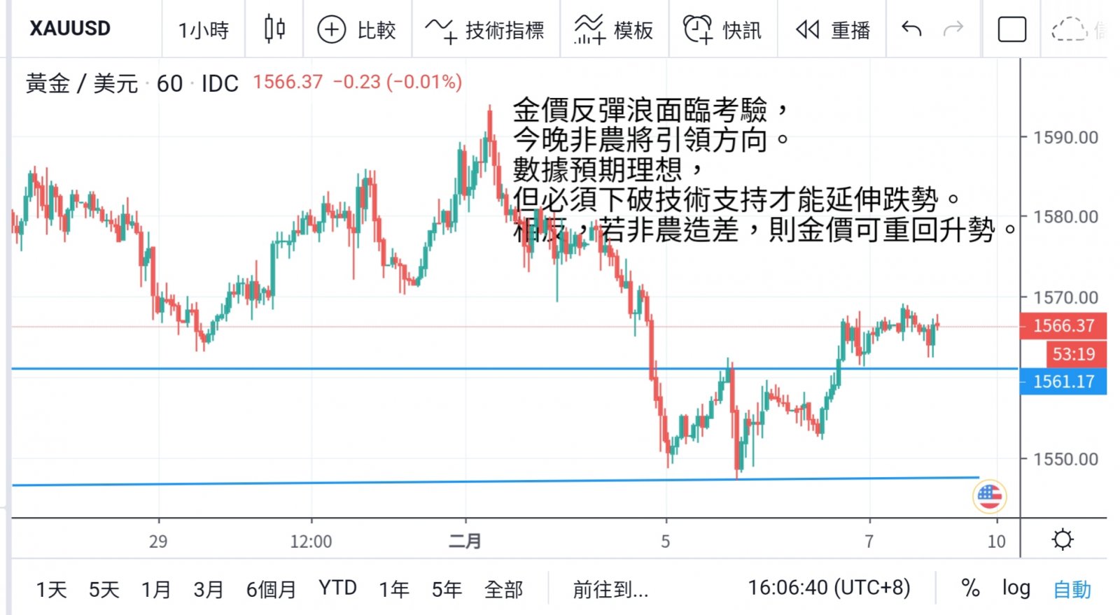 而預期勞工市場數據不弱下,金價難以即市作出突破,上方必需有效突破並企穩1570才能延伸上漲空間。