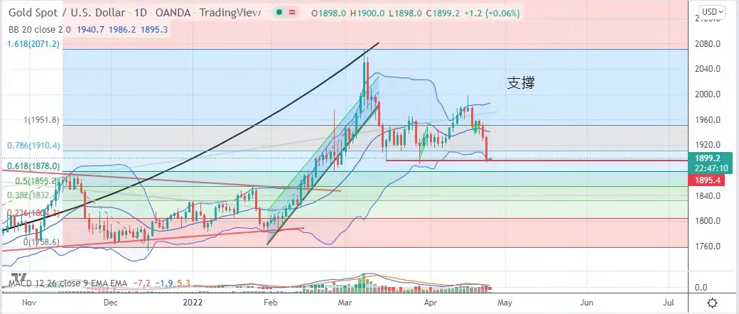 全球经济转差的讯号越来越强烈,欧美股市下跌,增加了黄金的吸引力,但明显金价在1910美元之上仍有压力,在俄乌战事持续之下,短期先要