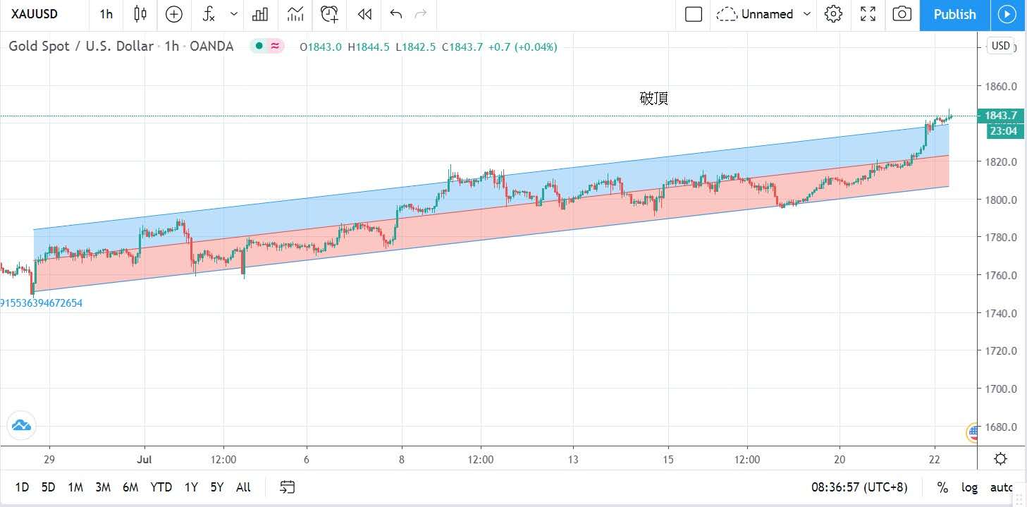美元指数走弱带动金价上升,金价昨日再创八年多来新高,亚洲开市时段即反复上升,待升破1825美元后则直破1840美元,最高曾升至1843.5美元,