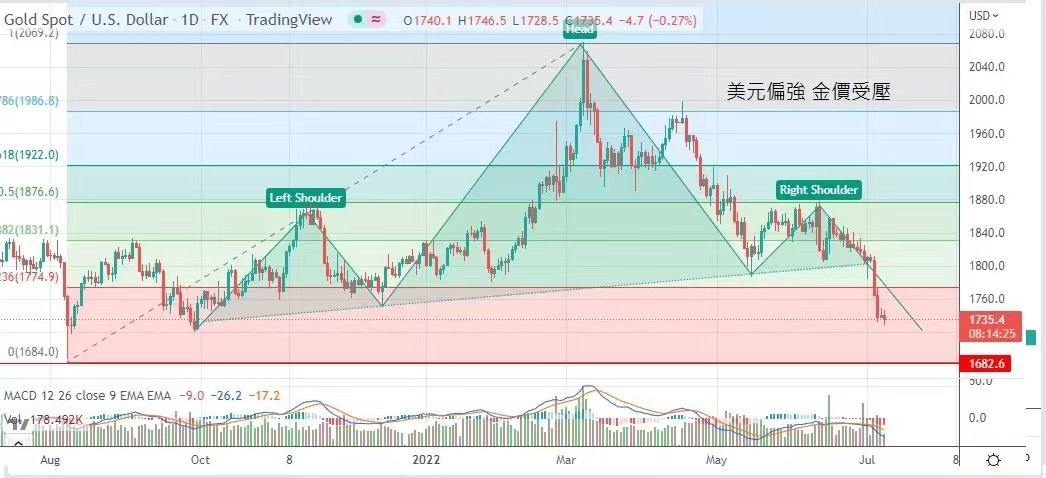来高位,美金的走强成为金价下跌的主要原因。金价在上周一高见位的1814.4美元后,在周二及周三大幅下跌,最差低见1732.2