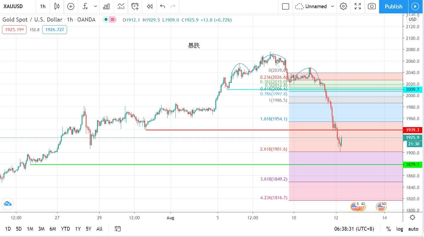 最高峰时在8月7日所创的历史高位每盎司2075美元,已预期会有调整,而走势上更出现大型头肩顶,引申一波又一波的跌浪,昨日保住1900水平,