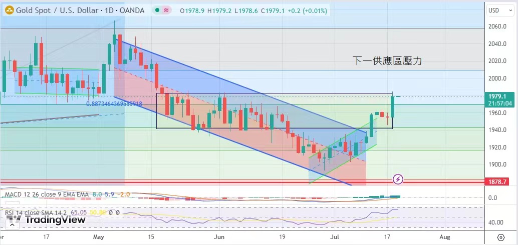 开始发挥力量,憧憬联储局将调整7 月加息的幅度,金价大幅攀升,金价正面临突破下一供应区的阻力,不