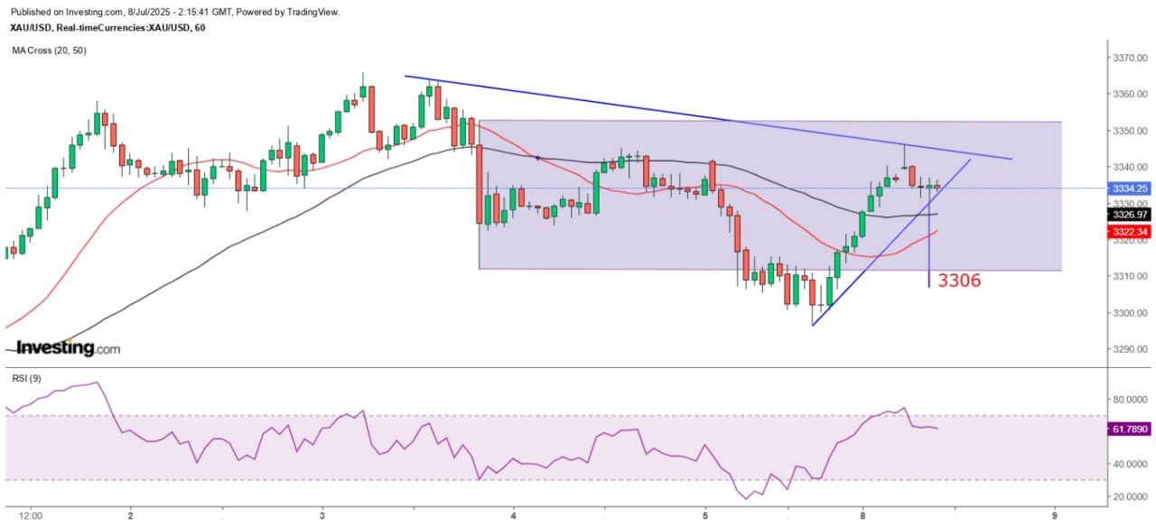 由于金价在7月3日呈穿头破脚形态收市,故在上破当天顶部3365.8收市之前料维持在3312至3365美元波动。短线而言,金价若在小时图下破上升轨,量度下跌目标约为3306美元,3346美元料为即市主要阻力位。由于美国今天并无重要数据公布,金价料继续呈上落市格局,惟关税相关消息将令金价表现更加波动。