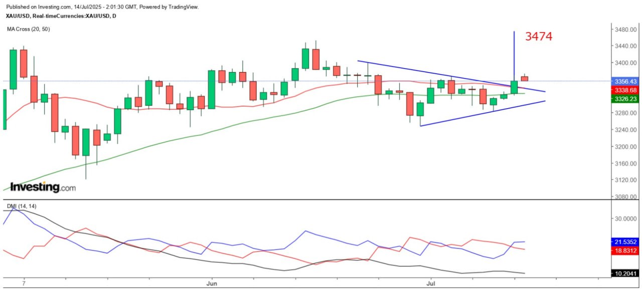 技术上,上周五金价在日线图收高于7月8日接近3346美元的高位及20日SMA(3338.8),且明显突破了TD供应线(下降轨),量度上升目标约为3474美元,由于目前属于初步向上突破,14日平均趋向指数(ADX)未见明显转向上行,+DMI虽上破-DMI,但近期亦多反复纠缠,但若金价最少连续三个交易日守稳在20日SMA及TD供应线以上收市,将进一步确认向上发展。