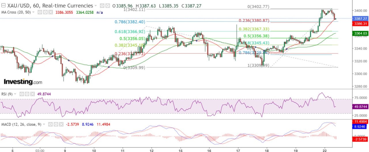 在小时图上,从7月9日以来的走势观察,金价今早触及的3402.77美元,已轻微超出费波纳奇100%扩展幅度所至的3402.11美元。换言之,7月9日以来的升浪料告一段落,金价短期内将进一步回调整固,金价今早高见3402美元后呈回跌,并呈穿头破脚形态,一旦金价在小时图收低于3386美元,预示将进一步回落,短线以7月17日接近3310美元以来最大升幅之50%为目标,即金价将跌至3356美元水平才有望回稳。