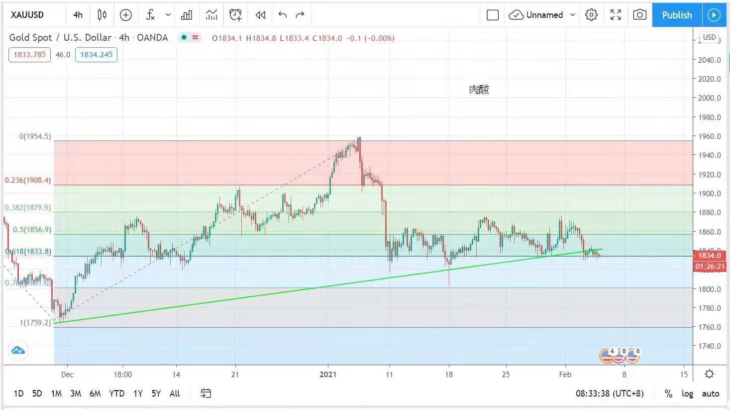 但走势肉酸,跌破近日支持线。预料今日仍是上落市,但上方买盘不积极,难以摆脱弱势,今日建议波幅在1828至1841美元之间。