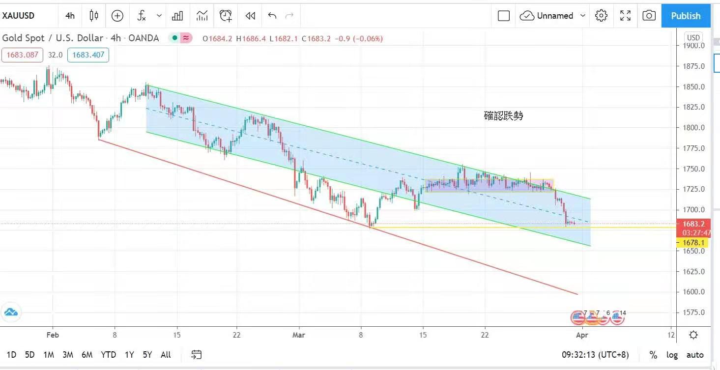 金价走势上仍受制于下降压力线,周一跌穿横行两星期的箱底的1720美元后确认跌势,昨日曾下试本月低位。
