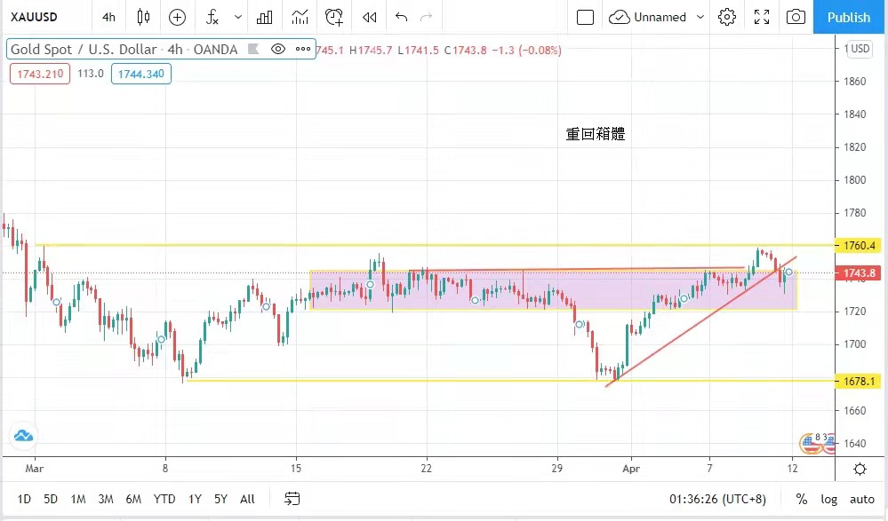 金价走势在上周四未能突破1760美元,果然重新考验盘整多时的箱体上方的1746美元支持位,上星期五收于其下的1743美元,