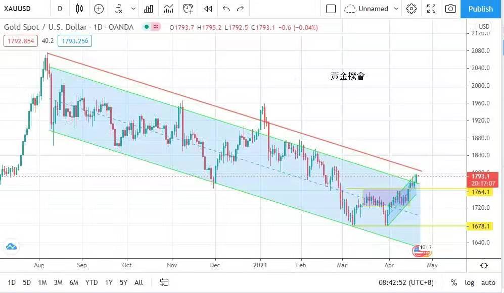 走势上,若守稳1788美元,再挑战下一站的1805美元。但预计1800美元心理关口仍较有阻力,所以目标不会一蹴而就,反而可以在1800美元