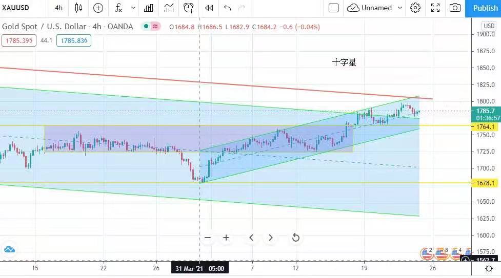 金价昨日因美元上升而下跌。昨日试冲前天所造的1798美元高位不破而回落,4小时图走势更出现十字星,之后逐步走低,
