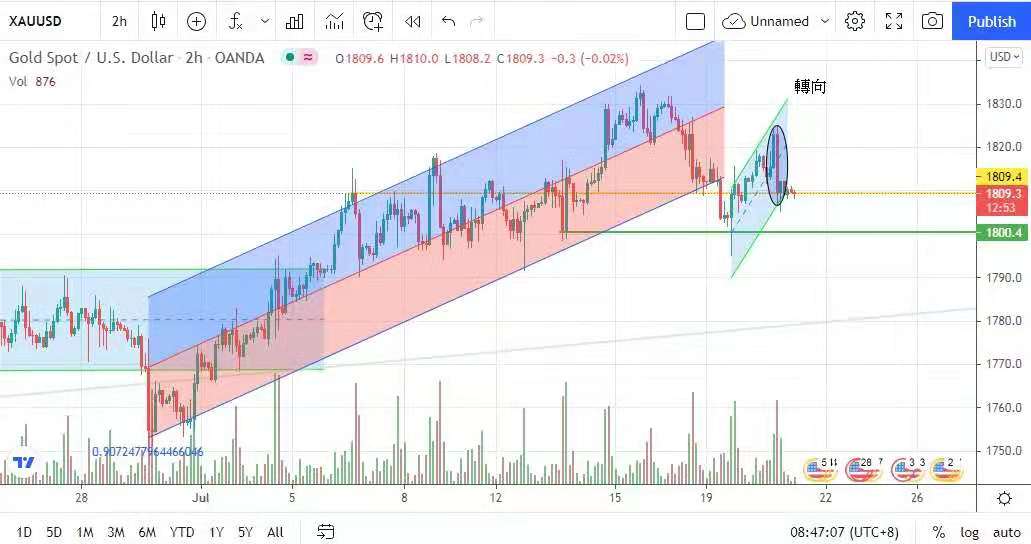 10年期国债孳息率重返1.2%以上水平。金价昨日先升后跌,早段升至日高1825美元,但美股开市后受,金价显注受压,金价昨日最低1805美元,最终反弹至1810美元收市,