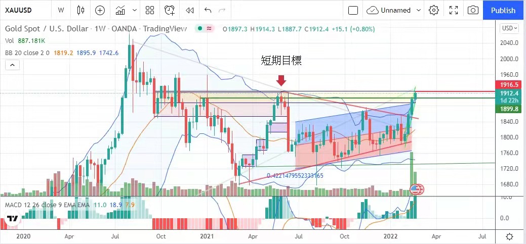 原因是俄罗斯与乌克兰已全面准备开战,消息令避险情绪升温,金价最低曾见1889.7美元,最高升至1910.5美元,以接近全日高位的1909美元收市,升10.6
