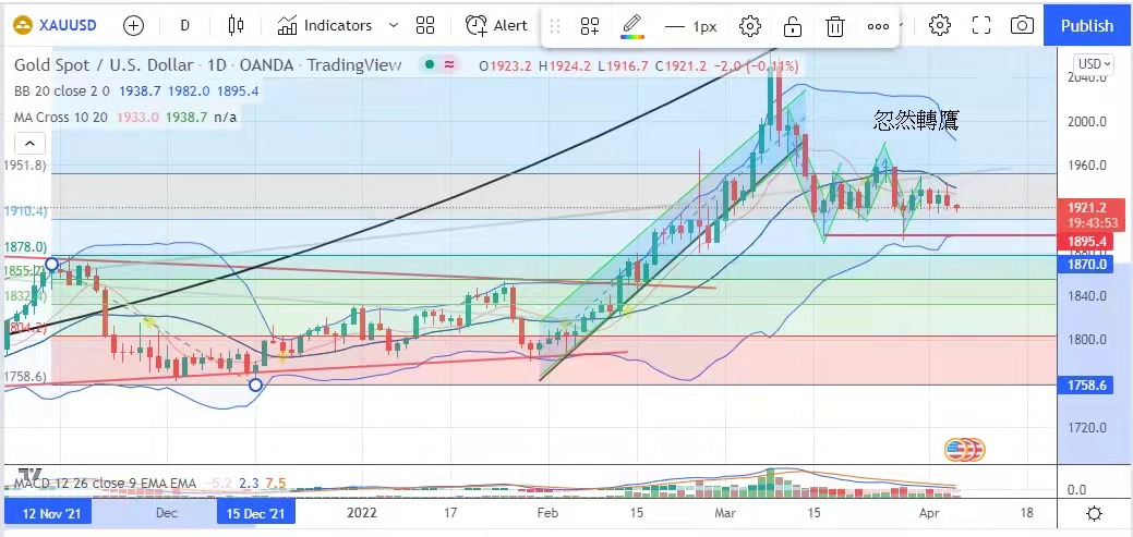 年半高位,金市受压下跌,金价昨日最低见1918美元,最高见1944.6美元,最后以1923.3美元收市,跌9.4美元。