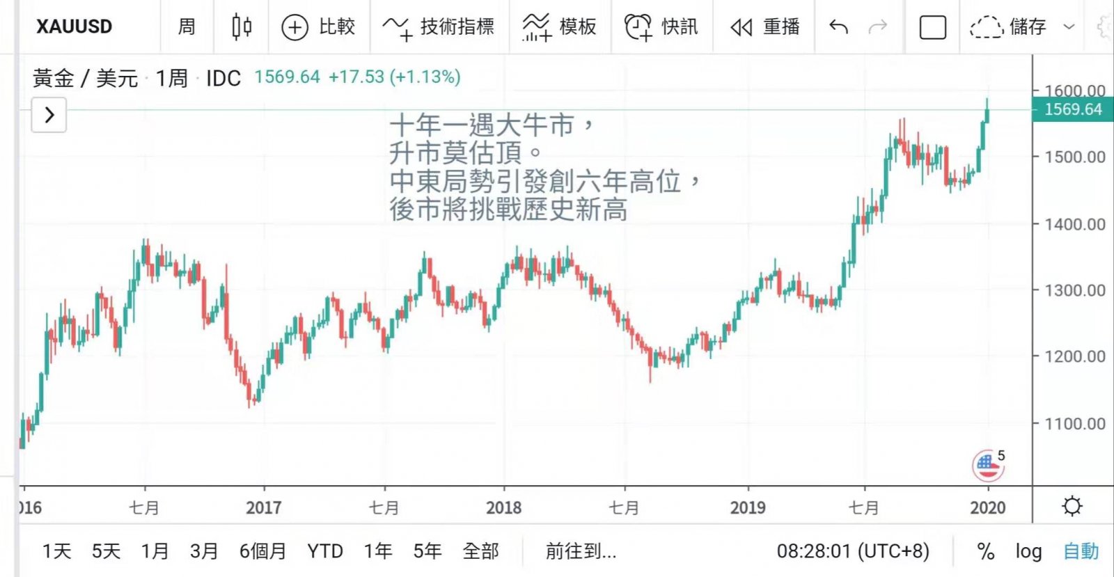 黄金进入十年一遇大牛市,升势迫人,达入2020年短短数交易日,升幅已达两成,
