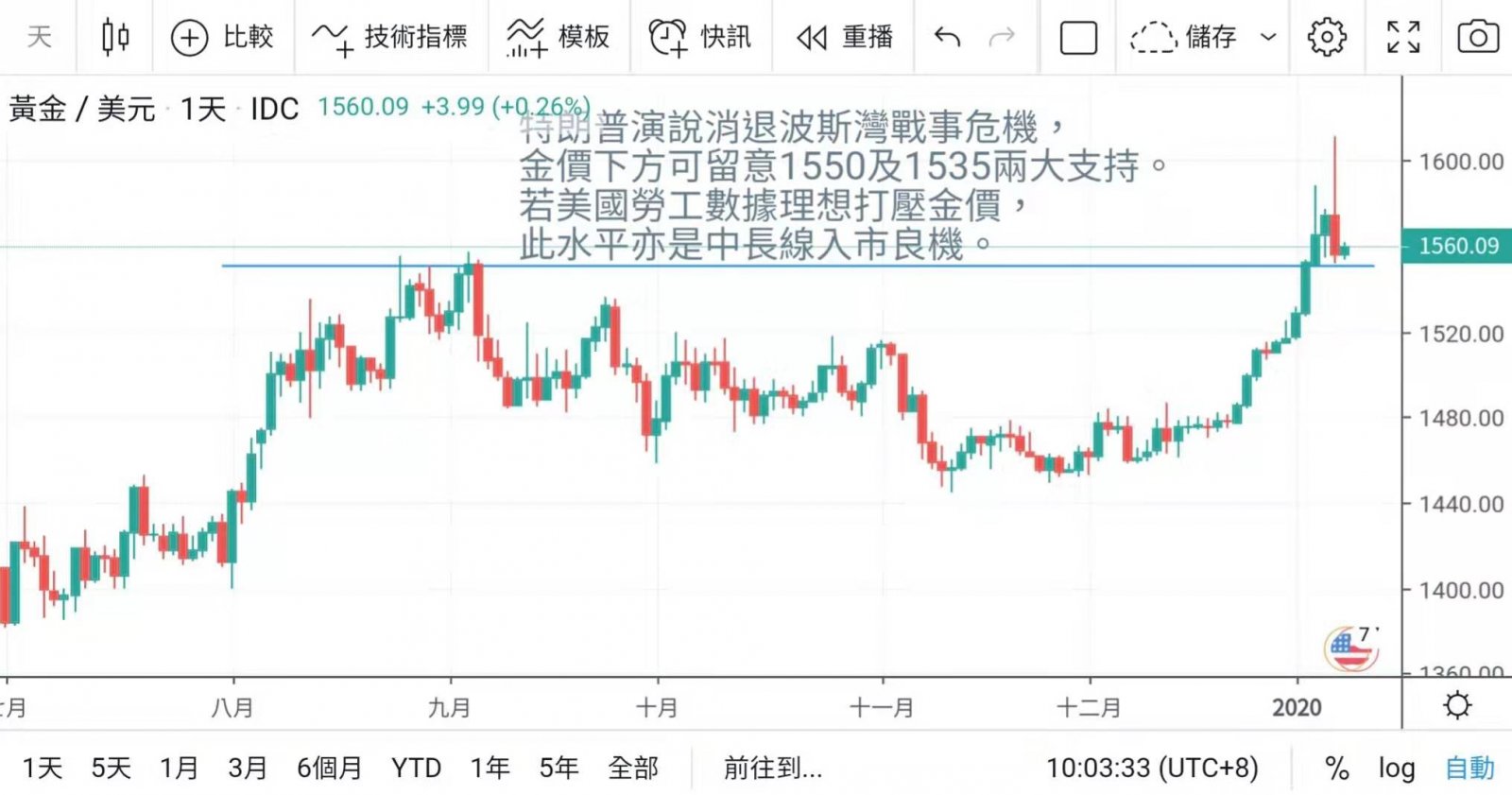 但美国总统特朗普晚间就伊朗局势发表演说,仅呼吁伊朗以和平手法处理问题,一道反高潮,意外令美股急升,金价跌回周内低位。
