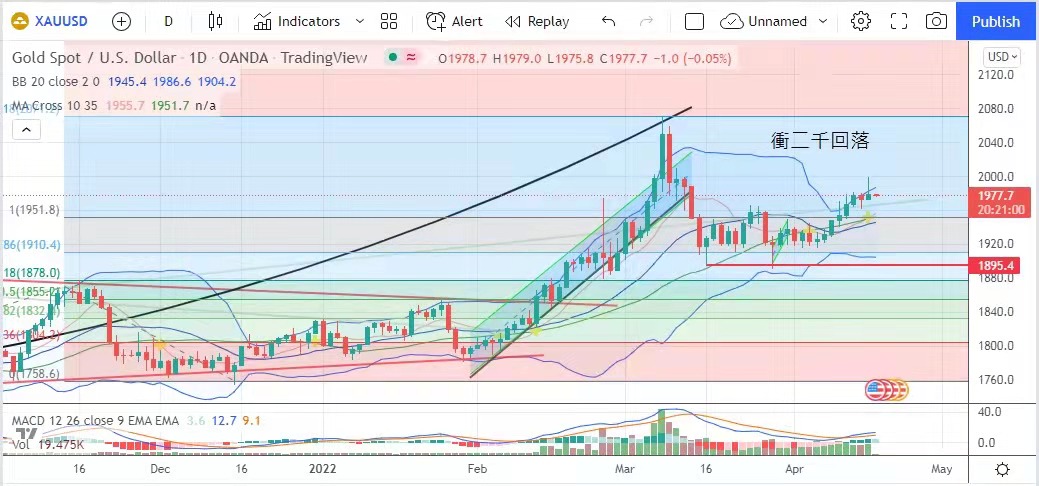 定俄烏戰事,只會在雙方分出勝負方會罷休。避險資金曾一度推升金價接近2000美元關口,金價最高升至1998.5美元,最低見1972.1,最後以1978.元