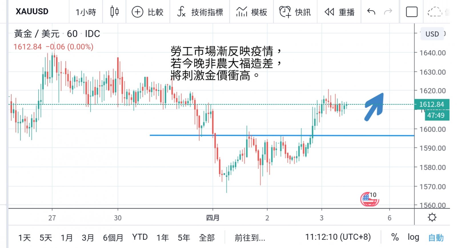金價重上1600上方,但今晚美國的非農業新增職位及失業率為全週重點,而且勞工市場定必惡化,勢令市場再現波動。