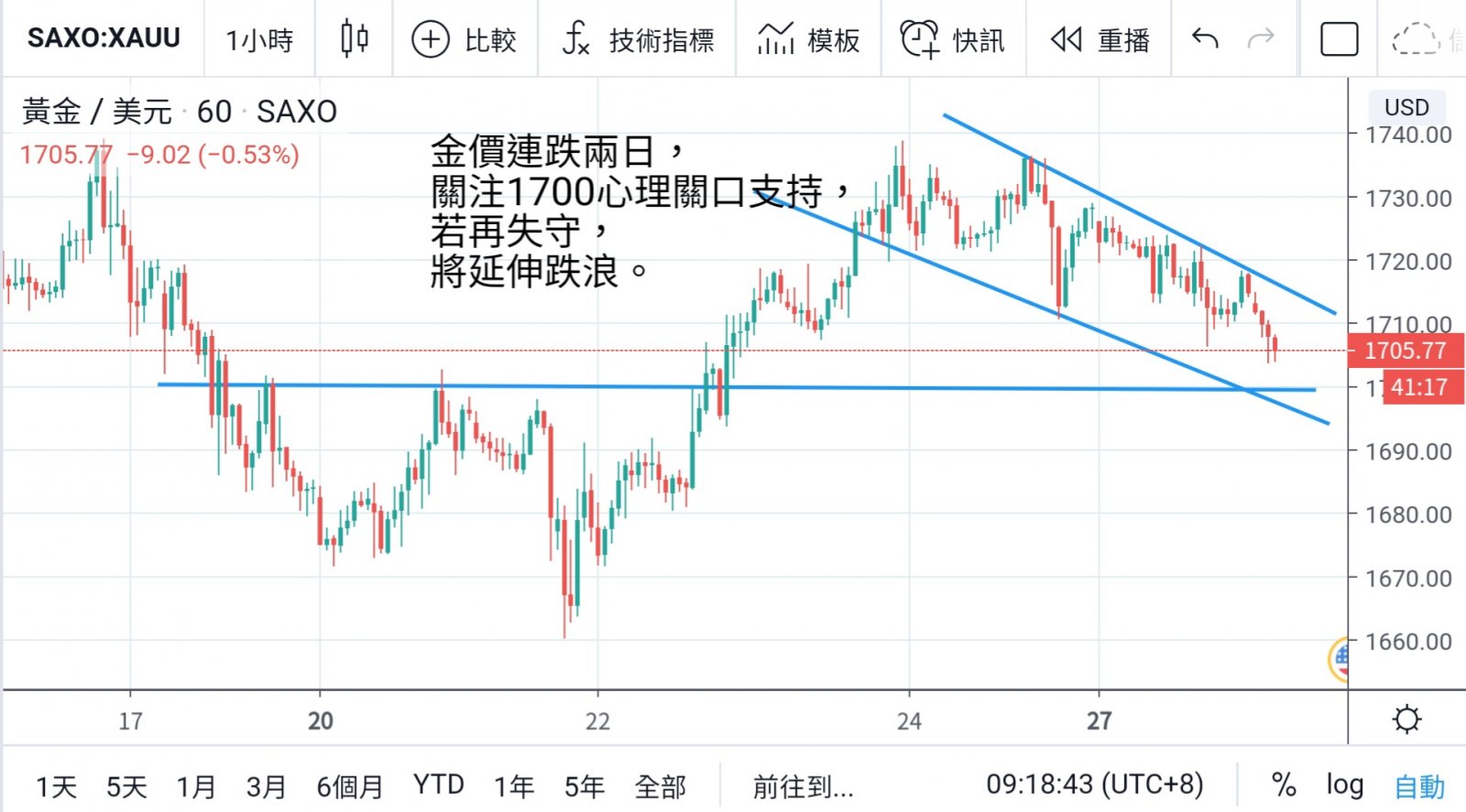 將延伸下方下跌通道,目標可望逹至1680美元方向。