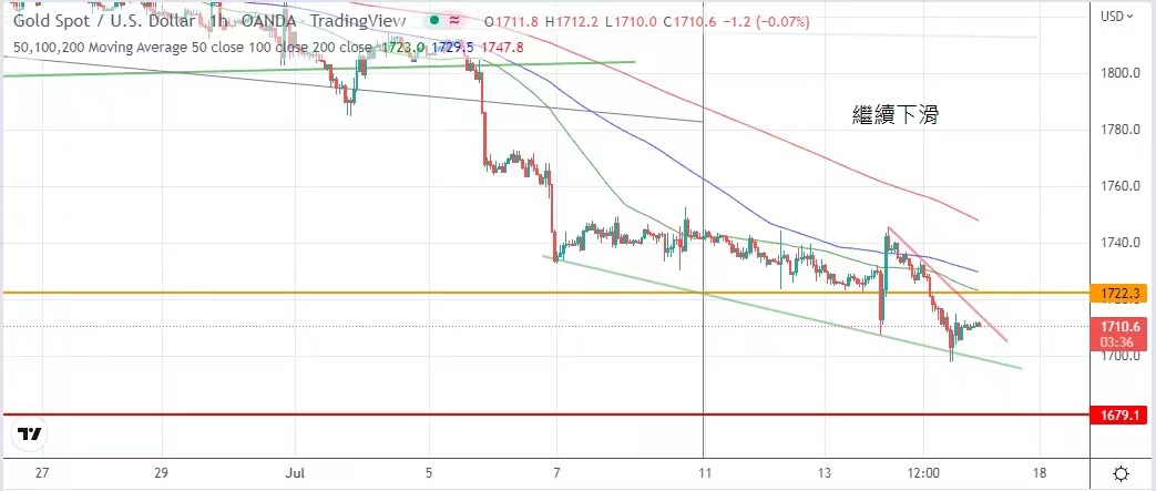 最差時一度跌穿1700美元,之後兩位美聯儲官員出來表示支持在七月分加息0.75%,金價稍為反彈,顯示金價在1700美元有較