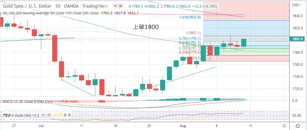 落有助緩和美聯儲加息步伐,金價1802美元收市,金價在上星期最低見1771.2美元,最高見見1808美元。總結一星期,金價升26.2美