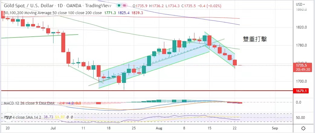 率升穿3%,金價在雙重打壓之下連跌六日,支撐點不斷向下,預計後市仍是跌多升少,下一支持位在1725美元,跌
