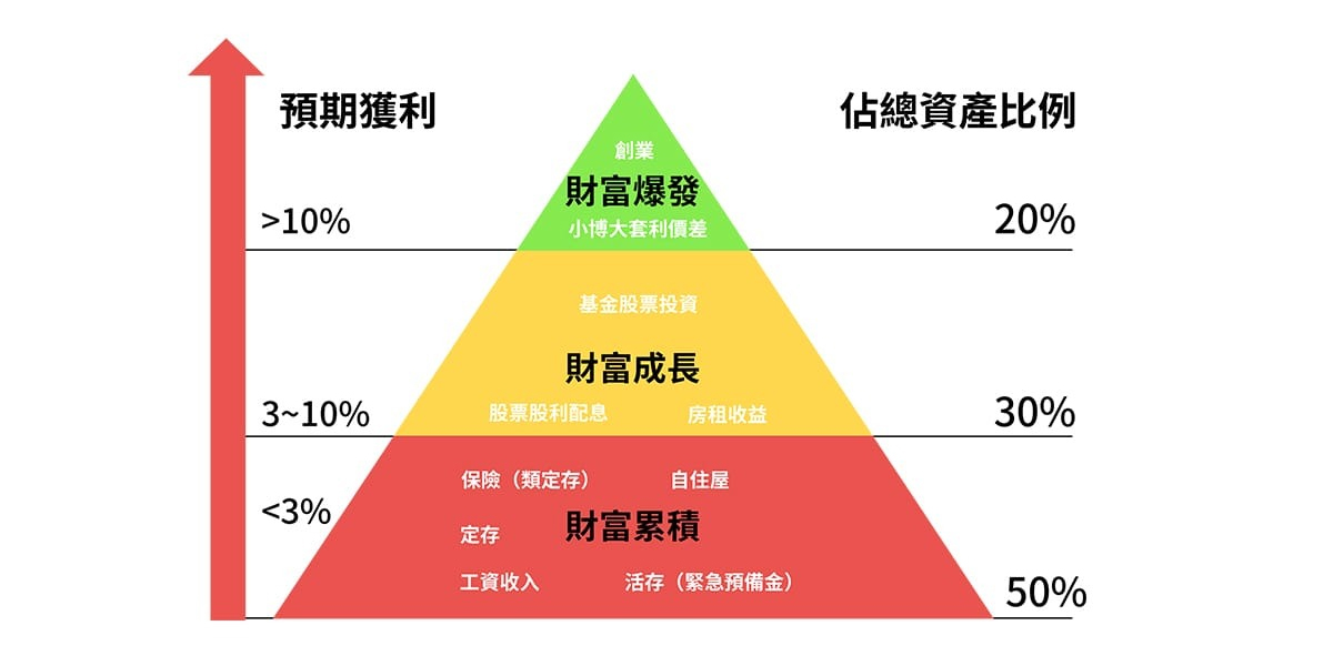 累積,就要學懂理財金字塔。金字塔既概念係底座要穩,上輕下重,才能穩陣向上。