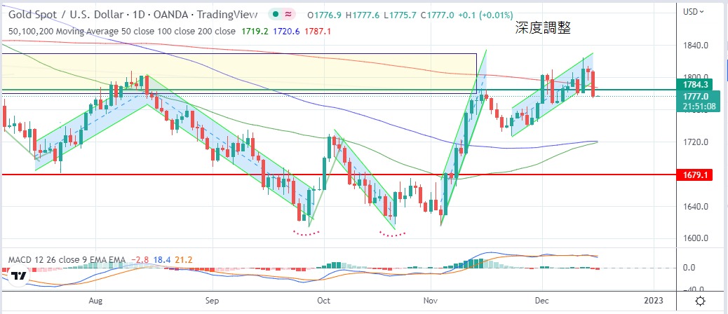 指數昨日迫近105點,金市完全受壓,最低見1773.8美元,金價最高見1808.7美元,以1776.9美元收市,跌30.6美元。