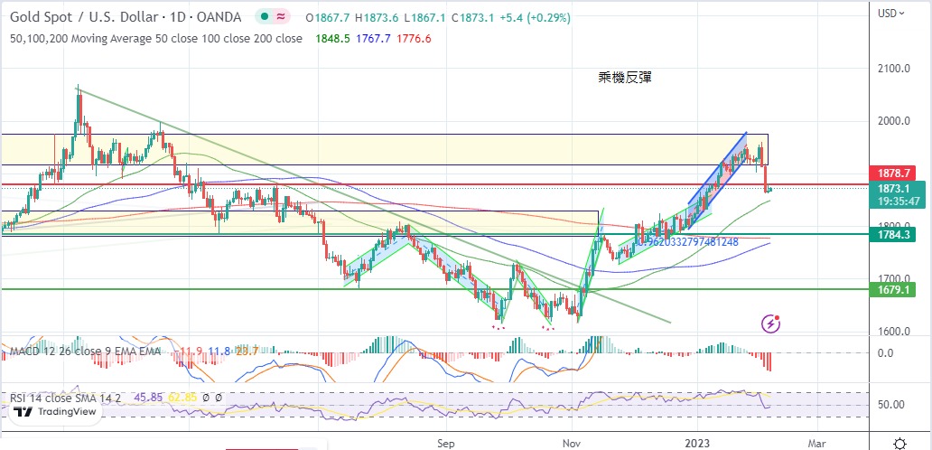 彈,最高見1881.4美元,但驚慓過後,市場轉回關注聯儲局後向,金價升幅收窄,金價最低見1867.1美元,以1867.7