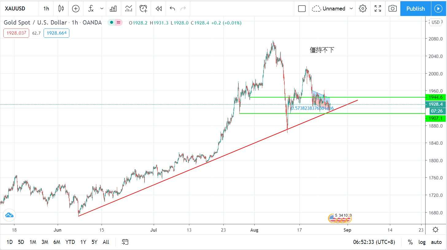 中美關係稍為緩和,加上美元輕微下跌,金價昨日震盪,波幅比上日略為收窄至24美元,高位見每盎司1938美元,