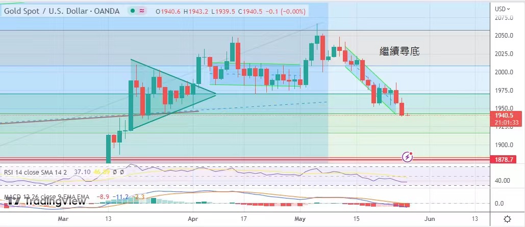 次加息的預期升溫,金價市日未能擺脫跌勢,繼續試底,跌穿1950美元支持。今日建議波幅於1934美元至1952