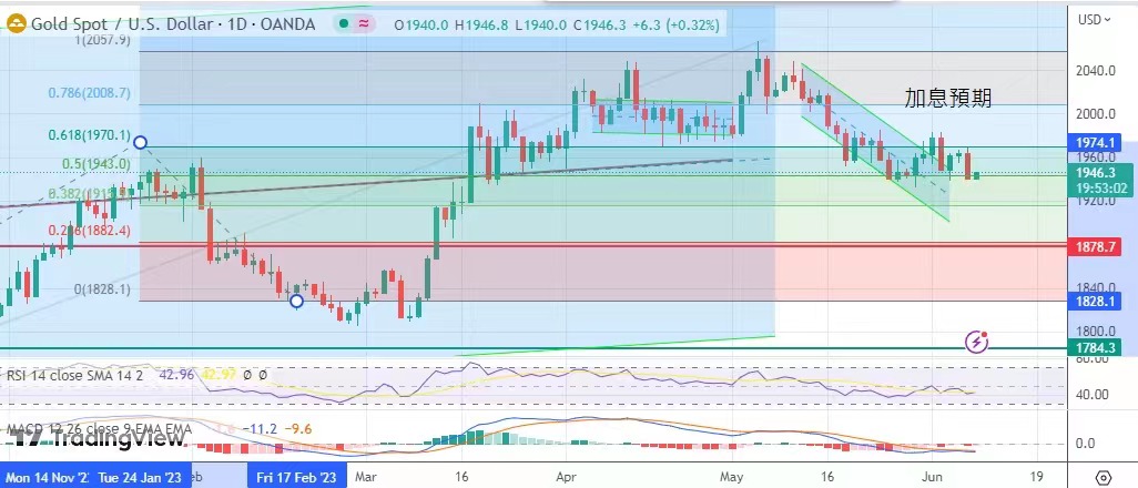 受壓。市場仍在觀望下周的通脹數據及美聯儲議息,昨日一跌反映7月再次加息的預期,金市仍將在1940至19