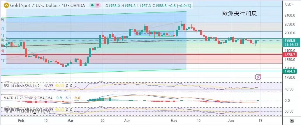 論般測試本年3月中的低位,歐洲央行宣布加息0.25之後,美元指數下跌至102點邊緣,金價V型反彈。金價這