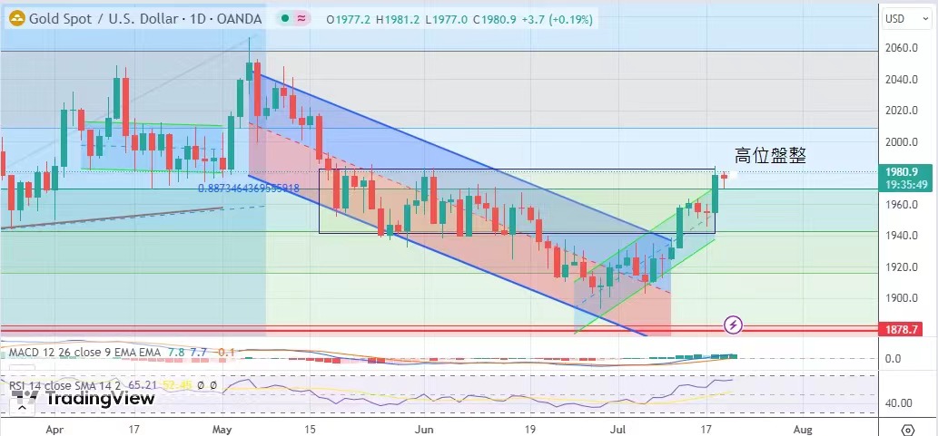 在1970站穩,期待在盤整之後再闖高位,同樣,金價正面臨突破下一供應區的阻力,不妨在周二所做的高位