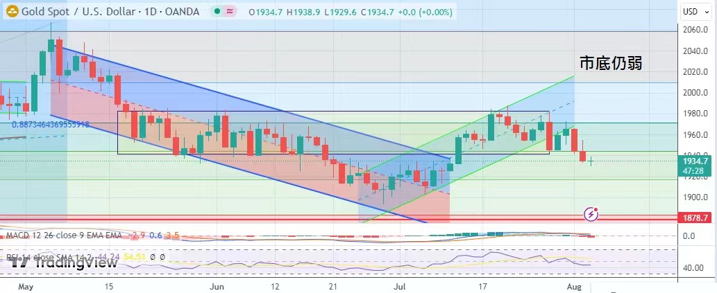 判斷入市方向,金價全日波幅不足5美元,最終接近平收。金價最高曾造1938.9美元,最低見1929.6美元,最終